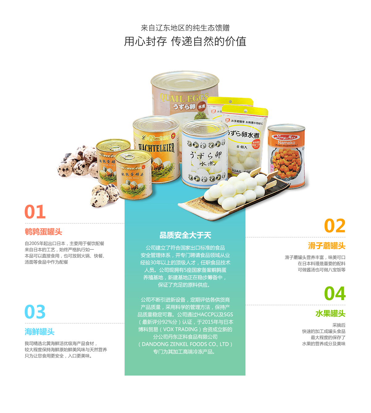 丹東日食食品有限公司是一家專注罐頭及速凍生產的食品加工型企業。公司主要產品為鵪鶉蛋罐頭、滑子蘑罐頭、冷凍產品等,年產量約5000噸。其中,鵪鶉蛋罐頭出口量位居近年國內之冠;滑子蘑罐頭出口量也列國內前位。各種產品主要出口日本,并遠銷德國、澳大利亞、新加坡等國家和地區。